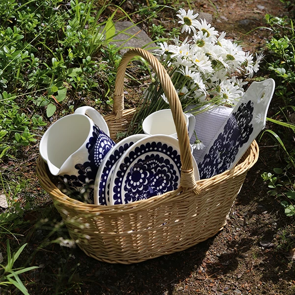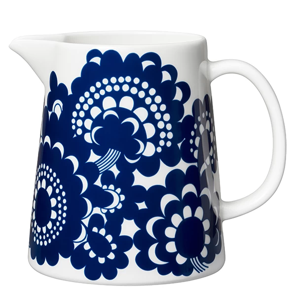 Der Esteri-Krug von Arabia ist mit einem wunderschönen Blumenmotiv verziert, das von Esteri Tomula zu Ehren des 100-jährigen Jubiläums des Unternehmens im Jahr 1973 entworfen wurde. Das nach seiner Designerin benannte Esteri-Muster diente ursprünglich der Verzierung von Geschirr in Blau und Braun. Das frische blau-weiße Muster bringt ungezwungenen wie auch festlichen Tafelrunden den schönen Hauch von finnischem Design der 1970er Jahre.