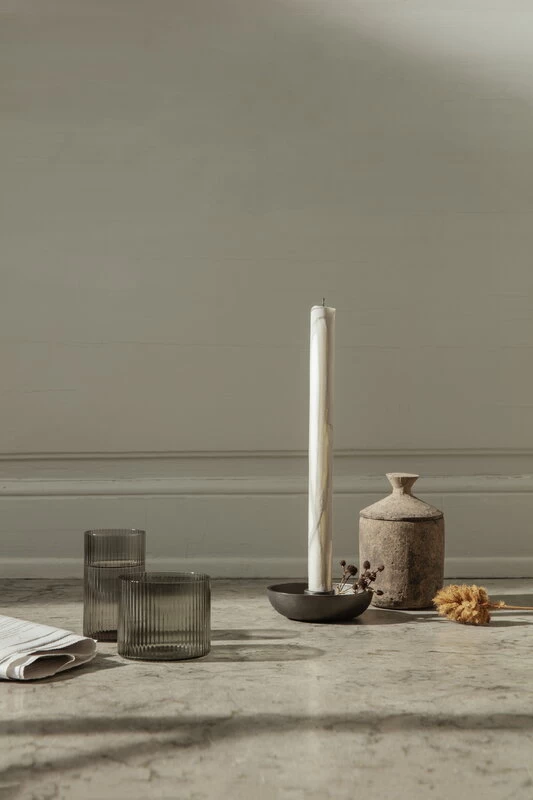 Die Glaswaren der Ripple-Kollektion von ferm LIVING werden in einer Form mundgeblasen. Das Ergebnis ist eine lebendige Riffeloberfläche, die bei jedem Stück etwas unterschiedlich ausfällt. Die eleganten Gläser eignen sich perfekt für jede Art von Feiern, die funktionelle Form passt auch bei ungezwungenen Anlässen.