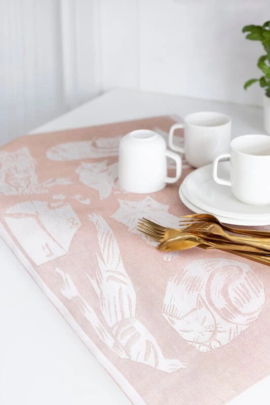 Das Kissanpäivät-Händehandtuch von Lapuan Kankurit ist mit charmanten und wunderschönen Katzen verziert, die vom Zeichner Matti Pikkujämsä entworfen wurden. Die Farben der Handtücher aus einer Leinen-Baumwoll-Mischung sorgen für eine wohnliche Note. Das niedliche Katzenmuster ist auf der anderen Seite in entgegengesetzten Farben gespiegelt. Die Materialien des Kissanpäivät-Handtuchs stammen aus Europa (hauptsächlich aus Finnland). Das Händehandtuch wird in einer Näherei in Litauen oder in Finnland in Lapuan Kankurits eigener Weberei hergestellt.