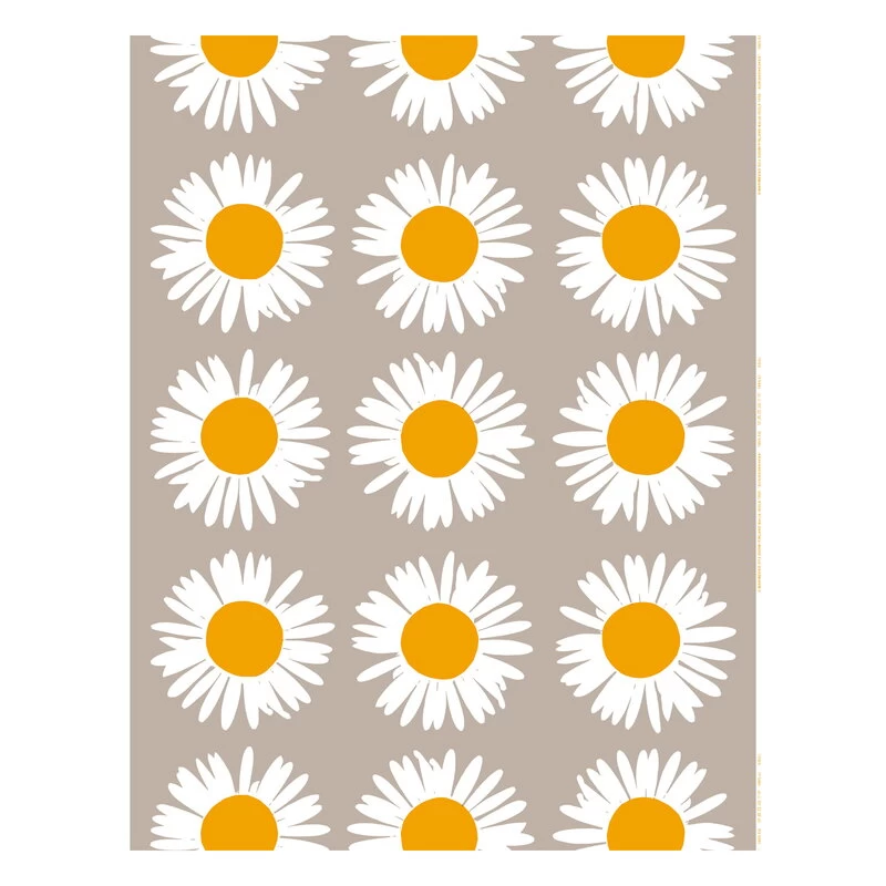 Dieser Leinenstoff von Marimekko ist mit dem fröhlichen Auringonkukka-Print verziert. Das ist das finnische Wort für „Sonnenblume“. Der von Maija Isola in den 1950er Jahren entworfene Motivdruck ist eines von Isolas zahlreichen Pflanzenmustern, die ihre tiefe und unerschütterliche Liebe zur Natur widerspiegeln.