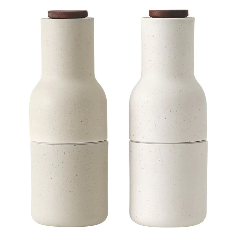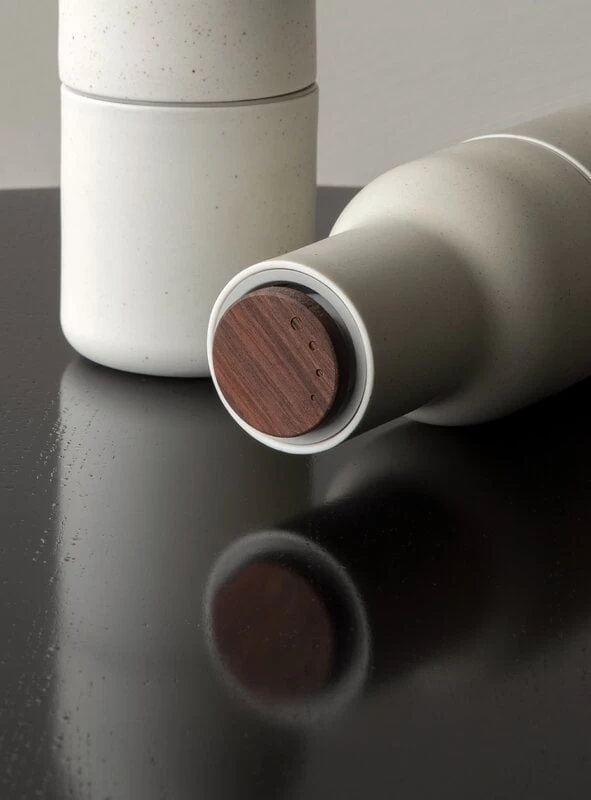 Das Set enthält zwei Gewürzmühlen in verschiedenen Farbtönen, die perfekt mit Einstellknöpfen aus Holz abgerundet sind. Die Mühlen sind aus Keramik gefertigt und mit einer matten Glasur versehen, deren kleine dunkle Flecken und Unvollkommenheiten den Mühlen ein schönes handgemachtes Aussehen verleihen.