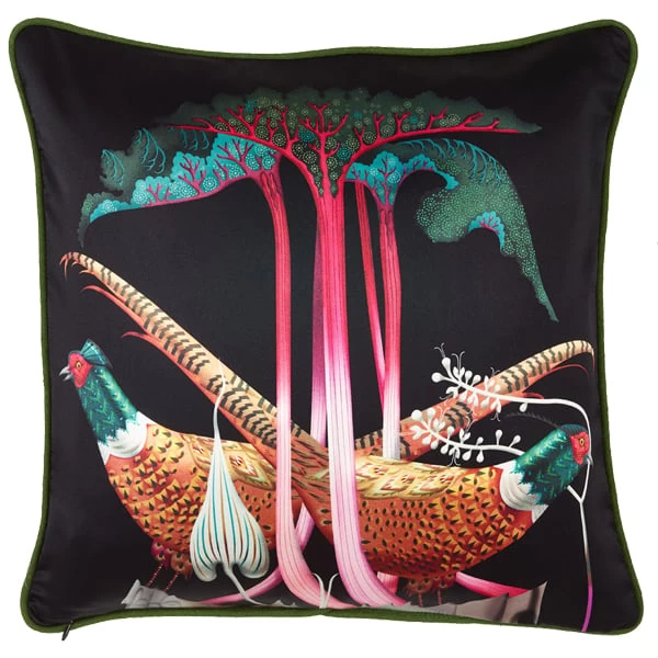 Klaus Haapaniemis Kissenbezug Pheasants and Rhubarbs zeigt zwei stattliche männliche Fasane unter schönem Rhabarber. Die bedruckte Seite des limitierten Kissenbezugs besteht aus reiner Seide und die Rückseite aus moosgrünem Leinen. Der Druck Pheasants and Rhubarbs ist ein reizvolles Beispiel für die üppigen und detaillierten Illustrationen von Haapaniemi, die in jedem Umfeld die Aufmerksamkeit auf sich ziehen.