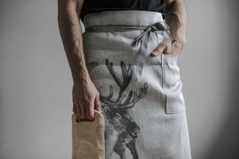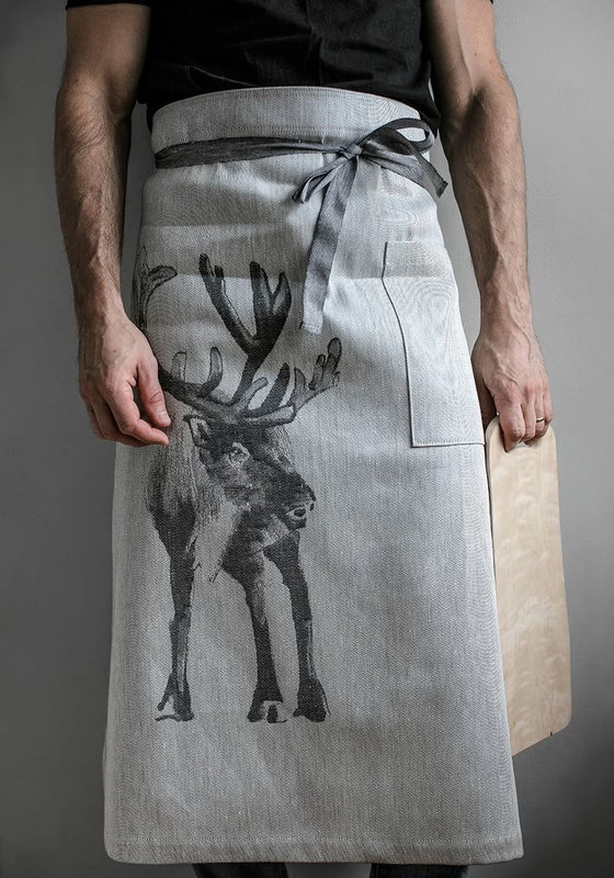 Die Poro-Hüftschürze von Lapuan Kankurit ist mit einer Illustration von Teemu Järvi verziert, die ein lappländisches Rentier darstellt. Die Schürze ist nach dem finnischen Wort für das majestätische Tier benannt. Die Hüftschürze wird in der Lapuan Kankurit-Webmanufaktur in Finnland aus European Masters of Linen-Leinen und Bio-Baumwolle gewebt. Durch die Jacquard-Webart hat die Schürze eine schöne abwechslungsreiche Oberfläche, die ihr einen lässigen Look verleiht und das von der Natur inspirierte Motiv unterstreicht. Die Schürze ist mit einer praktischen Tasche sowie mit einem Taillenband ausgestattet.
