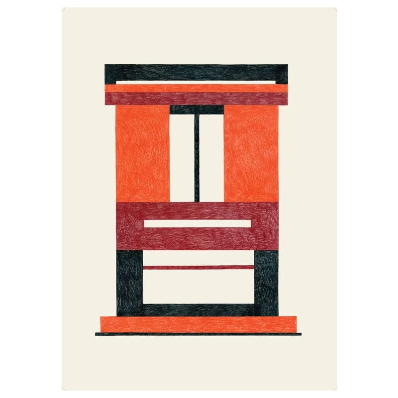 Das Poster Caldo von Nathalie Du Pasquier zeigt geometrische Formen in Kombination mit kräftigen, markanten Farbtönen. Die abstrakten Elemente bilden eine Struktur, die jedoch nicht dreidimensional nachgebaut werden kann. Die sichtbaren Striche auf den Farbblöcken verleihen dem Plakat Tiefe und machen deutlich, dass das Originalwerk trotz seiner präzisen Geometrie nicht digital erstellt wurde.