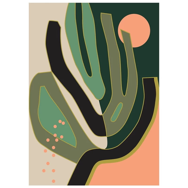 Das Selva-Poster von Paper Collective stammt von der mexikanischen Künstlerin Berenice Hernández und ist vom dichten, grünen Urwald Mittelamerikas inspiriert. Das Poster zeigt ein einzelnes Monstera-Blatt mit schwarzen, orangefarbenen und goldenen Details, die an das schattige Licht des Urwalds erinnern.
