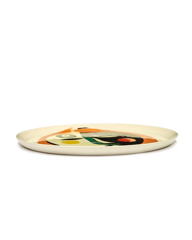 Der Feast-Servierteller von Serax ist mit einem abstrakten Gesicht verziert, das entweder zu lächeln oder zu staunen scheint. Die Deutung des Ausdrucks liegt ganz bei der betrachtenden Person. Der verspielte große Teller eignet sich ideal zum Servieren von Fisch, Salat, Gebäck oder Desserts.