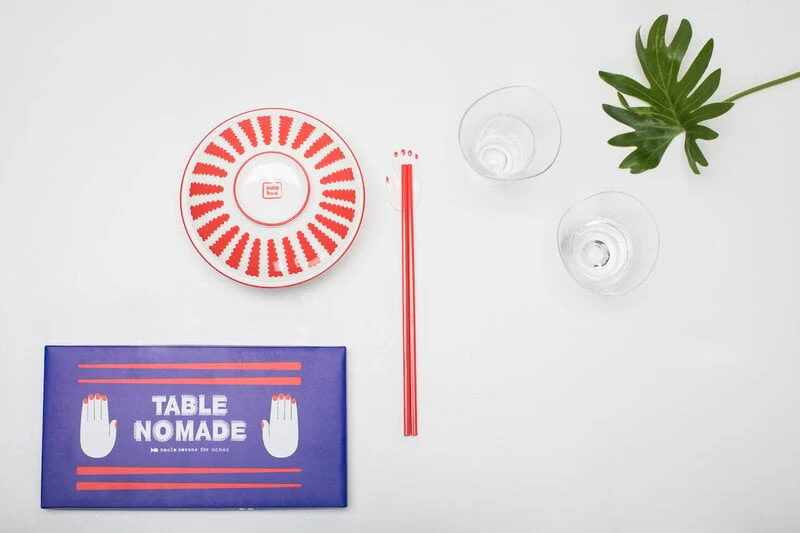 Das „Table Nomade“-Essstäbchen-Set von Serax besteht aus zwei Paar Essstäbchen und charmanten Haltern in Form von Händen mit lackierten Nägeln. Die von Paola Navone entworfenen Essstäbchen aus rotem Melamin und die weißen Porzellanhalter sind in einer indigoblauen Geschenkbox verpackt. Das für asiatische Speisen geeignete Set setzt farbliche Akzente auf dem gedeckten Tisch und sorgt für Gesprächsstoff am Esstisch.