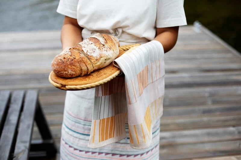 Das Sointu-Geschirrhandtuch besteht aus einer hochwertigen Mischung aus Leinen und Bio-Baumwolle. Die Flachsfasern, aus denen das Leinen hergestellt wurde, stammen aus Europa, insbesondere aus der französischen Normandie, und wurden für Qualität und Rückverfolgbarkeit mit dem Label „Masters of Linen“ ausgezeichnet. Alle Garne werden in Europa nach der REACH-Verordnung und dem Oeko-Tex-Standard sowohl gesponnen als auch gefärbt. Der Stoff des Sointu-Geschirrhandtuchs wird in der eigenen Weberei von Lapuan Kankurit in Finnland gewebt.