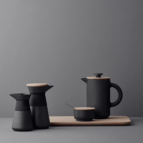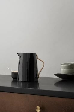 Das Milchkännchen Theo von Stelton besteht aus dunklem, rustikalem Steingut. Die Innenseite wurde mit einer glänzenden Glasur beschichtet, die einen schönen Kontrast zur schwarzen, matten Oberfläche bildet.