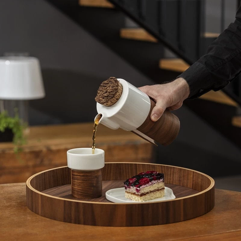 Die Tee- und Kaffeetassen aus der Warm-Kollektion von Tonfisk Design (Fassungsvermögen 2,4 dl) verzaubern mit einer sanften Kombination aus Porzellan und Holz. Die stapelbaren Tassen sind spülmaschinengeeignet, die abnehmbare Holzmanschette kann mit einem feuchten Tuch abgewischt und gelegentlich geölt werden. Das Set enthält zwei Tassen (à 2,4 dl).